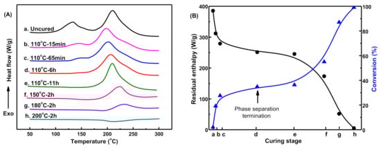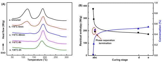 (A) DSC curves, (B) the Residual enthalpy and corresponding conversion of MOEA-BOZ/DGEBA-ER/IMZ (12 wt%) blend with 30 wt% of ER after curing at different stages.