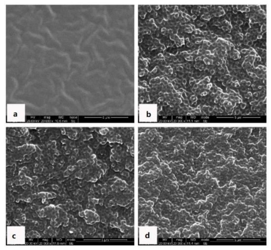 In previous SEM observations of MDA-BOZ/DGEBA-ER/IMZ blending systems, etching was essential to distinguish the two phases (Figure S2), which is unfavorable for studying the phase evolution process. However, for the current MOEA-BOZ/DGEBA-ER/IMZ systems, the phase structures could be clearly distinguished without etching, which enabled more accurate investigations of phase separation process. As shown in Figure 4, different morphologies were observed in MOEA-BOZ/DGEBA-ER/IMZ resins by varying the compositions of DGEBA-ER after curing at 110 °C for 17 h. When the composition of DGEBA-ER was not higher than 30 wt%, a sea-island structure was observed (Figure 4a), and with the increase in ER content, the population of dispersed ‘islands’ increased dramatically (Figure 4b). When the composition of ER reached to 50 wt% however, an inverse phase structure was observed (Figure 4c), where dispersed phases were trapped in the reticular continuous phase. Continuously increasing the ER content, no phase separation structures could be observed (Figure 4d).