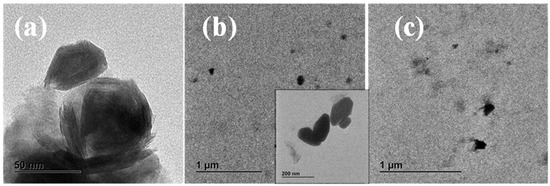 TEM micrographs for (a) neat IF-WS2 nanoparticles, (b) PLLA/IF-WS2 (0.1 wt%) and (c) PLLA/IF-WS2 (1.0 wt%) nanocomposites.