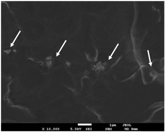 High-resolution SEM micrograph for PLLA/IF-WS2 (1.0 wt%) nanocomposites. The white arrows indicate the IF-WS2.