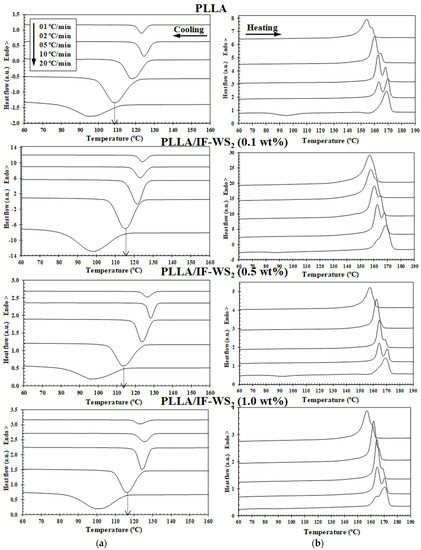 (a) Differential scanning calorimetry (DSC) melt–crystallization thermograms of PLLA and PLLA/IF-WS2 nanocomposites with nanofiller loadings of 0.1, 0.5 and 1.0 wt% obtained at the indicated cooling rates and (b) second-run heating curves obtained at a constant heating rate of 10 °C/min.