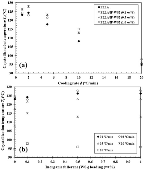 Variation of the melt–crystallization temperature (Tc) for PLLA/IF-WS2 nanocomposites with (a) cooling rate and (b) composition.