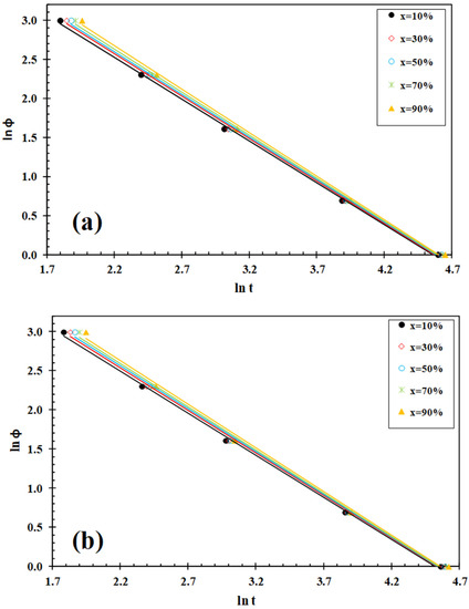 where the kinetic parameter f(T)= [k′(T)/k]1/m refers to the value of the cooling rate that has to be chosen at the unit crystallization time when the measured system amounts to a certain degree of crystallinity; α is the ratio of the Avrami exponent n to the Ozawa exponent m (α = n/m). According to Equation (1), at a given degree of conversion, the f(T) parameters of the linear relationship between the plots of lnφ vs. lnt are obtained (Figure 6). This indicates that the Lui model fits well with the experimental data of the new PLLA/IF-WS2 nanocomposites. From the slopes and the intercepts of these lines, the values of α and f(T) could be obtained (Table 2). As can be seen, the values of f(T) for PLLA and its PLLA/IF-WS2 nanocomposites progressively increases with the increase in the relative crystallinity, which indicates that at unit crystallization time, a higher cooling rate should be used to obtain a higher degree of crystallinity. In all cases, the values of α are almost constant (i.e., about 1.0–1.1). However, the most relevant observation was the influence of IF-WS2 concentration on the value of f(T) of PLLA for a particular degree of conversion. In particular, it was observed that the value of f(T) for PLLA is higher than that for the PLLA/IF-WS2 nanocomposites, suggesting that the nanocomposites require a lower heating rate to approach an identical degree of crystalline transformation. This implies the acceleration of the crystallization rate of PLLA due to the nucleation effect of IF-WS2, while the crystallization mechanism of PLLA remained unchanged in spite of nanoparticle loading. This is because the values of the α parameter are approximately the same for both PLLA and the PLLA/IF-WS2 nanocomposites (1.0–1.1).
