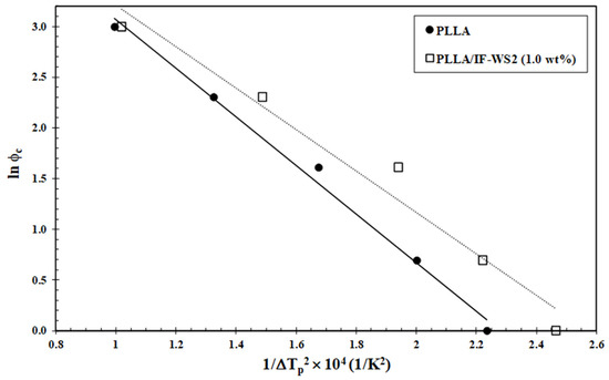 where φ is the cooling rate, A is a constant, and ΔTc denotes the degree of supercooling (T0m−Tc). Plots of lnφ vs. 1/ΔTc for pure PLLA and PLLA/IF-WS2 nanocomposites are shown in Figure 7. It is apparent that a linear relationship is obtained for each sample, assuming the equilibrium melting point T0m of PLLA as 195 °C [37]. The values of B and B* are obtained from the slope of the fitted lines, and the nucleation activity is calculated from their ratio. The corresponding φ values are 1.07, 0.80 and 0.81 for PLLA/IF-WS2 (0.1 wt%), PLLA/IF-WS2 (0.5 wt%) and PLLA/IF-WS2 (1.0 wt%), respectively. These results indicate that IF-WS2 behaves as an effective nucleating agent when the concentration of IF-WS2 is set between 0.5 and 1.0 wt%. However, the excellent nucleation-promoting effect was achieved when the WS2 nanoparticles were added as nanotube-like nanoparticles (φ = 0.22–0.25) [24]. In contrast, the incorporation of WS2 nanosheets induced a significant reduction in the crystallization rate of PLLA due to the inactive nucleating role of WS2 [25]. Such differences again suggest that the nanoparticle shape plays a fundamental role in PLLA crystallization.