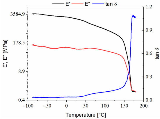 Around the 155 °C temperature on the tanδ curve, there is an increase which is attributed to the beginning of material softening (liquid flow), which also, according to previous calorimetric determinations of the research group, [13], has a melting point at 158 °C. Additionally, with the beginning of material softening, the abrupt decrease in E′ and E″ curves takes place, as a plasticizing effect of melting and of high temperature—the macromolecular chains of Arboblend® V2 Nature start to slide side by side and generate the flowing phenomenon in the flowing (terminal) region. Thus, the mechanical analysis in dynamic regime cannot be performed further;