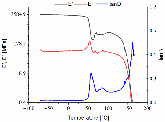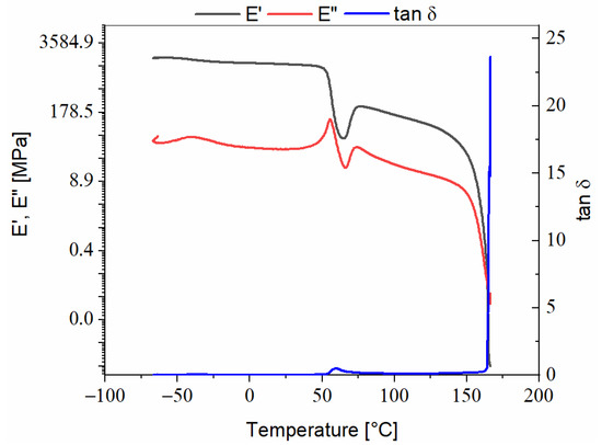 Figure 4. DMA thermogram recorded during heating of Arboform® LV3 Nature reinforced with aramid fibers.