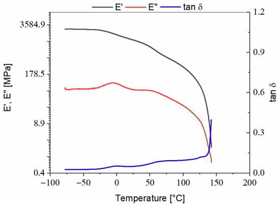 On the damping curve, a representative peak with a maximum value of 0.37 appears at a temperature of 57 °C in the α relaxation region, the temperature at which Tg (glass transition) of the reinforced material takes place. A second, much lower peak can be observed with a centered tanδ at 0.18 and a temperature of 86.52 °C, which can be associated with a transformation that occurs in the material structure during its progressive heating, most likely to be water evaporation and/or the decomposition of natural additives or dyes [15]. On the damping curve, no transition that could be associated with the reinforcement—aramid fibers—is noticed, as it is thermally stable up to 450 °C [16], well above the range set for this analysis, and the glass transition of the aramid fibers appears in the (345–360) °C temperature range, [17]; otherwise, there are only losses of hydrogen bonds;
