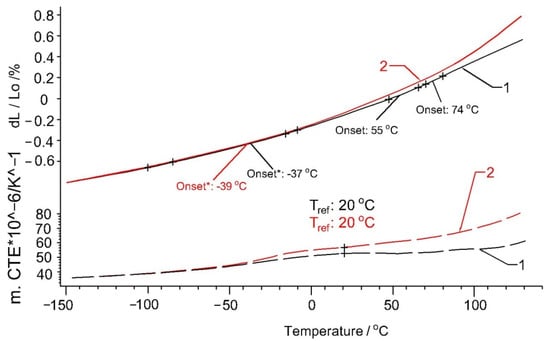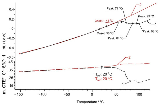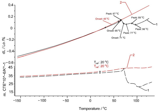 The dilatometer measurements were carried out using the following parameters: sample holder—SiO2; sample thermocouple—type K; pushrod force—0.05 N; atmosphere—He at 40 mL/min; temperature program—−150 °C to 120 °C at 10 K/min; reference sample—Al2O3; sample length—~25 mm.