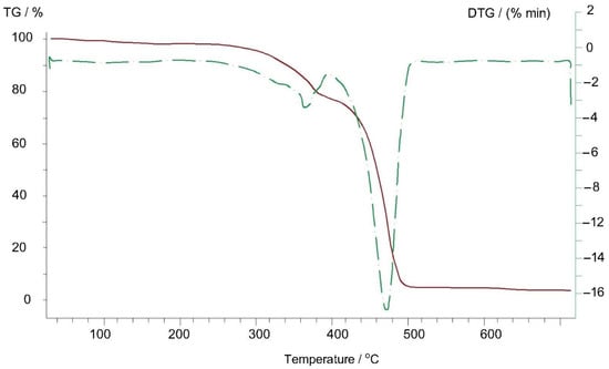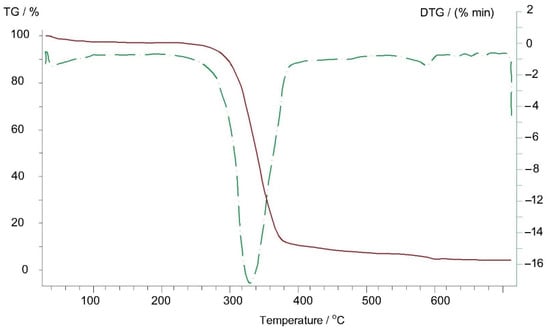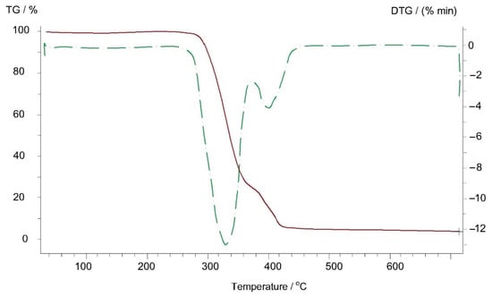 Thermogravimetric analysis was performed using TGA NETZSCH STA 449 F1 Jupiter equipment (NETZSCH-Gerätebau GmbH, Selb, Germany) with a TG thermocouple, Proteus 6.0 software. The mass of the samples was in the range of 40–45 mg and was heated with a rate of 10 K/min, carrier gas—nitrogen (99.999% purity) with 250 mL/min flow rate, 25–700 °C temperature range. The samples were heated in an open Al2O3 crucible and an empty crucible was used as the reference material.