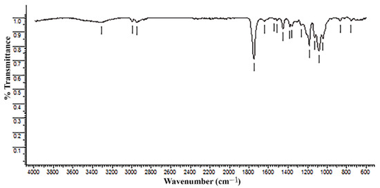 Another strong band is recorded at 1084 cm−1, corresponding to deformation of C–O–C anti-symmetrical stretching of polysaccharide [46] cellulose belonging to this category. Additionally, at 1181 cm−1, a strong absorption band belonging to the C-O-C ester group is recorded [44];