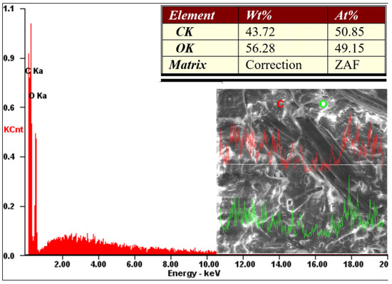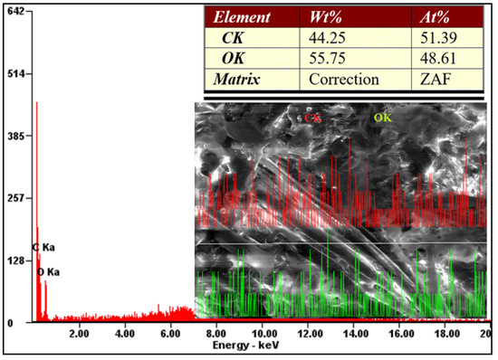 The sample from Arboform® LV3 Nature, reinforced with aramid fibers (synthetic), has a chemical structure approximately similar to that of the pure biopolymer, as shown in Figure 17. This was influenced by the small amount (15%) of reinforcement introduced. Normally, according to the literature, aramid fibers of the Kevlar type—DuPont—are made by a condensation reaction of an amine and acid chloride, resulting an aromatic polyamide (para-aramid). The chemical elements involved in the aramid fibers’ structure are: hydrogen, azote, oxygen and carbon, [58]. However, in the EDX analysis performed, only the carbon and oxygen content were visible, most likely due to the too small amount of the other elements.