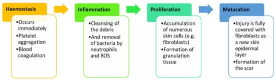 Wound healing is an important physiological and complex process, involving a multifaceted process, including the hemostasis phase, inflammation phase, proliferation phase, and maturation phase (Figure 2) []. The hemostasis phase occurs immediately after the injury and the exposed collagen, sub-endothelium, and tissue factor trigger platelet aggregation that results in degranulation and the release of growth factors (GFs) and chemokines to form the blood clot []. Hemostasis usually occurs concurrently with the inflammation phase. In the inflammation phase, neutrophils at the wound site cleanse the debris and remove bacteria together with reactive oxygen species (ROS), thereby offering an appropriate environment for the wound healing process []. The injury site tends to become red, swollen, and warm due to the presence of white blood cells [].