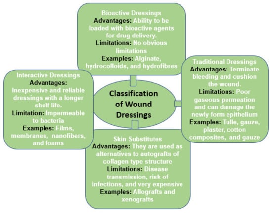 Wound dressings are materials used to protect a wound. They also act as a barrier against pathogens. An ideal wound dressing offers good features, such as good applicability, biocompatibility, stability, and flexibility, as well as ensuring a good gas barrier and biodegradability to speed up the healing process and reduce the risk of infections. Wound dressings must also be able to manage wound exudates to prevent bacterial invasion []. Wound dressings are categorized as primary and secondary dressings. The primary wound dressings are applied directly to the wounded area, while the secondary dressing is used to cover the primary wound dressing []. There are various applications of wound dressing materials. Hence, they are classified into four groups, namely traditional/passive dressings, skin substitutes, interactive/artificial dressings, and bioactive dressings (Figure 3).