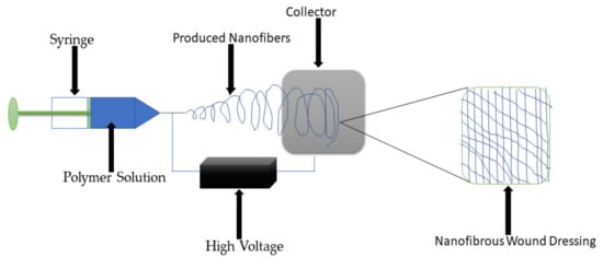 Nanofibers are wound dressing materials that possess diameter sizes that range from nanometers to a few microns []. The popularly used technique for the preparation of these materials is electrospinning (Figure 8) []. The electrospun nanofibers are considered appropriate wound dressings for chronic wounds because of their drug delivery capability. Nanofibers imitate the ECM, thereby promoting the proliferation of epithelial cells and the development of new tissues in the wound environment []. The advantages of the nanofibers and nanofibrous dressings include their ability to stimulate hemostasis of damaged tissues, promote dermal drug delivery, improve fluid absorption, high-gas permeation, cell respiration, high surface area to volume, high porosity, maintaining of the moist environment, thereby inhibiting microbial infections [,]. Many gelatin-based hybrid nanofibers have been reported by researchers for the treatment of different wounds (Table 4). Ajmal et al., formulated gelatin-PCL hybrid nanofibers co-loaded with quercetin and ciprofloxacin hydrochloride for wound healing application. The SEM micrographs of dual drug-loaded nanofibers displayed uniform size distribution, randomly oriented and beadless morphology mimicking the ECM, with an average diameter of approximately 234.172 ± 98.234 nm. The porosity of the nanofibers was in the range of 60–90%, suggesting that these nanofibers are suitable for sufficient exchange of gases and nutrients during the skin wound healing process. The FTIR and XRD data confirmed the successful formulation of gelatin-based nanofibers loaded with quercetin and ciprofloxacin [].