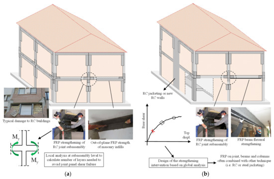 FRP-strengthening interventions adopted in accordance with a global strengthening strategy (a,b).