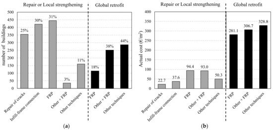 Distribution of strengthening interventions (a) and actual costs (b) for buildings subjected to repair or local strengthening (1416 buildings) or to a global retrofitting (454 buildings).