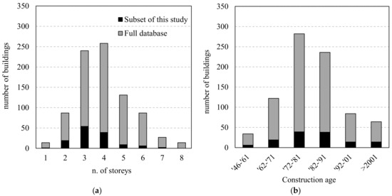 Distribution of the complete database of FRP-strengthened buildings (FRP and Other + FRP) (858 buildings) and the subset used in this study (130) in relation to: n. of storeys (a); construction age (b).