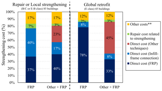 In the heavily damaged RC buildings that underwent global retrofitting using FRP systems, most of the overall expenditure comprised the direct cost of these systems (about 78%), with only 8% related to the installation of infill-to-frame connections. The cost of strengthening interventions amounted to about 2% of the total, which is relatively low given the level of disruption associated with global strengthening. However, it is worth noting that the extent of the damage in these severely damaged buildings (those subjected to global retrofit solutions) may mean that some of these repair costs were included in the general expenditure on repairs. Consequently, the numbers in Figure 4 in relation to global retrofitting are undoubtedly underestimates. Nevertheless, we were able to disaggregate the repair cost on repairs [26], which showed that these costs in relation to severely damaged buildings were about 81.26 €/m2, amounting to around 15.34% and 26% of the total reconstruction costs and strengthening costs, respectively. The other cost was approximately 12%, which is slightly less than that observed for locally-strengthened buildings. This is probably because some costs, such as those related to the installation of the construction field, are less significant in percentage terms in these cases.