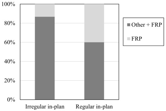 It is worth noting that where the strengthening intervention has to be designed using the results of a global analysis, FRP systems alone are unable to resolve all of the structural weaknesses detected (e.g., soft storeys, significant torsional effects). Accordingly, it is necessary to also adopt other strengthening techniques that can increase lateral stiffness. Indeed, as shown in Figure 5, the percentage of buildings strengthened using a combination of FRPs and other techniques increased for those with an in-plan irregularity (defined according to EC8 [27] prescriptions).