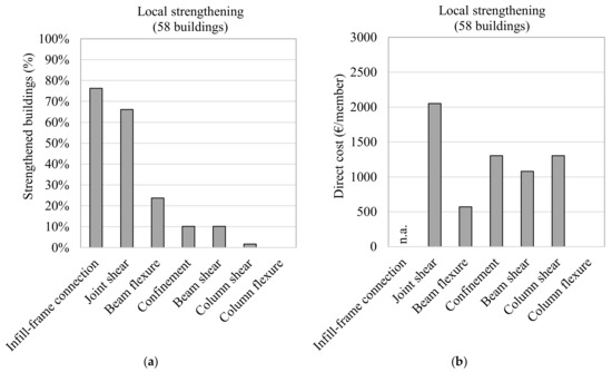 The goal of preventing local failures without significantly changing global structural behaviour (i.e., global stiffness and mass of the building) means that the main scope of a local-strengthening intervention is to recover/enhance the seismic capacity (strength or ductility) of the most critical structural and non-structural components. The distribution of the interventions adopted in a local-strengthening strategy are reported in Figure 6 in terms of the percentage of buildings involved (Figure 6a) and the mean direct cost of each member, expressed in €/member (Figure 6). The data are also summarised in Table 1 in relation to: the overall number of buildings; the percentage of buildings that employed the strengthening intervention; the mean number of FRP layers used for strengthening; the direct cost, expressed in €/member and normalised for the demolition and reconstruction (taken as 5344 €, 4008 €, and 6012 € for the beam-column joints, columns and beams, respectively [28]); and the mean number of strengthened members.