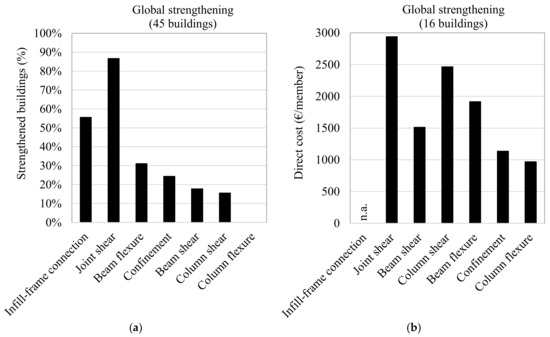 Figure 7a,b depict the number of buildings affected (in % terms) and the direct costs (expressed as €/member) of the solutions adopted in the building subset subjected to FRP-strengthening designed in accordance with a global retrofit strategy.