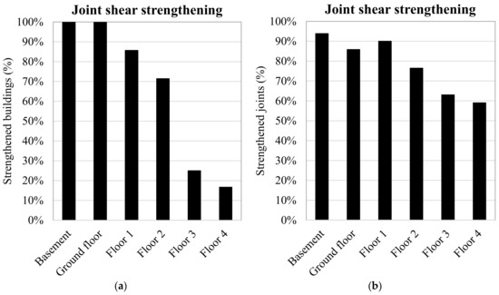 In detail, Figure 8a shows that the percentage of the beam-column joints strengthened with FRPs decreased with each increase in floor number from the ground floor up. All the buildings had been strengthened at the joints of the lower floors (basement and ground floor), while the 86% and 71% of the joints had been strengthened for floors 1 and 2, respectively. These numbers decreased to only 24% and 17% for floors 3 and 4.