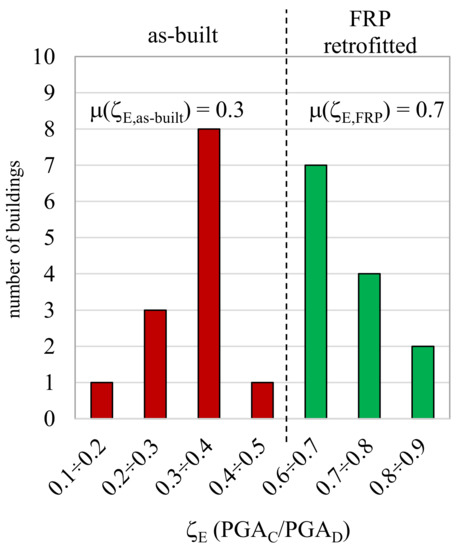 The use of joint-panel shear strengthening combined with other minor FRP interventions (see Figure 8 and Table 2) led to a significant increase in the overall seismic capacity. This is demonstrated clearly in Figure 10, which compares the building seismic capacity, represented by the safety index, ζE, in the as-built and FRP-strengthened configurations. As can be seen, there was a significant increase in seismic capacity, from a mean of about 0.3 for the as-built structures (ζE,as-built) to one of roughly 0.7 for those strengthened with FRPs (ζE,FRP).
