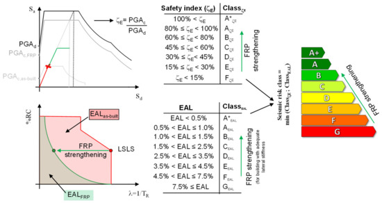 Strengthening the most critical structural components with FRPs improved both the global seismic performance (represented, e.g., by the increase in the displacement capacity of a pushover curve; see Figure 11) and the safety index, ζE. Such a rise in the latter at the LSLS may lead to a significant increase in ClassζE, based on the classifications set out in the Italian guidelines and summarised in Figure 11. However, a reduction in EALs (increase of ClassEAL) is also required to achieve an effective increase in the associated seismic-risk class. In structures designed to sustain low seismic actions, with adequate lateral stiffness, which was the case for most of the existing RC buildings in L’Aquila, FRP-strengthening prevents local premature brittle failures (conventionally assumed to be the attainment of the LSLS). This allows the performance at the LSLS to be improved, resulting in a significant drop in EALs (see Figure 10).