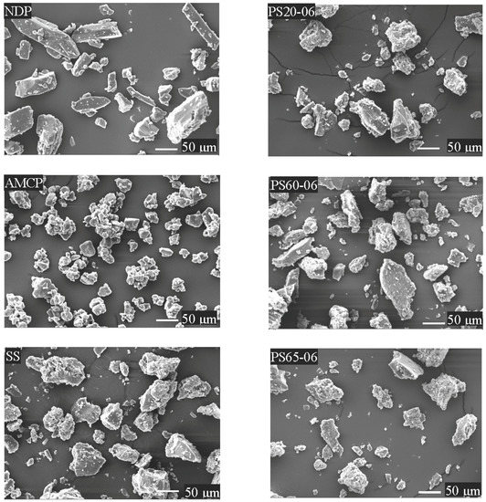 Solid solutions were prepared as described in Table 1. In the preliminary study, the addition of surfactants at concentrations > 0.6% was attempted; however, soft masses were obtained. Solid solutions containing 0.1%, 0.3%, or 0.6% PS were obtained as fine yellow particles after comminution and sieving (60#). Figure 1 presents the scanning electron microscopy (SEM) images of the solid solutions, polymers, and NDP. The SEM images revealed that NDP had a smooth surface and rectangular shape, whereas AMCP (ground) featured a rough surface and an irregular shape. All solid solutions appeared to have irregular shapes (images for solutions containing 0.1% or 0.3% PS are not shown). NDP seemed to be homogeneously dispersed within the carrier matrix of the solid solution.