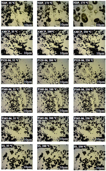A hot stage microscopy was used to examine the microscopic findings of the solid solutions after changing the temperature of NDP and the solid solution. (Figure 2). The images showed that NDP melted at 173 °C, as reported previously [2]. No physical change was observed in AMCP, and similar results were obtained for all solid solutions [23] (some data not shown). These results suggested that a small amount of surfactant (0.1%, 0.3%, or 0.6%) did not change the morphology of solid solutions under temperature alteration.