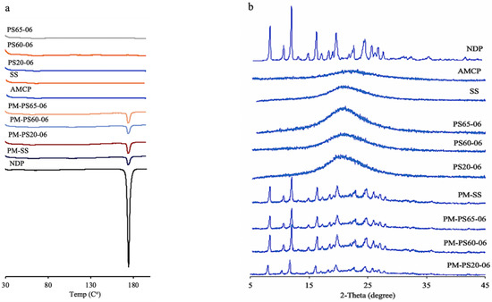 Figure 3a presents the thermograms of NDP, the solid solutions, and PMs. A high-intensity endothermic peak was observed for NDP powder (173 °C). A low-intensity peak corresponding to NDP was observed in PMs. The results suggest that the peak position of NDP remained unchanged. No peak was found for any solid solution samples (some data not shown). These results corresponded to the images of the hot stage study.