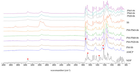 FTIR spectrum of NDP, AMCP, physical mixtures (PMs), SS, PS20-06, PS60-06 and PS65-06: red square represent major functional groups in NDP while red star represent main functional groups in AMCP.