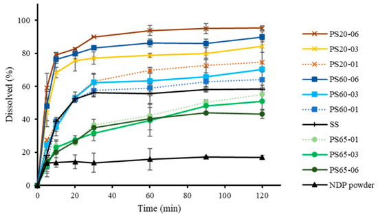 An assessment of NDP dissolution was conducted (Figure 5). The dissolution of NDP and the solid solutions after 20 and 120 min is presented in Table 3. At 120 min, the percentages of the drug dissolved from the solid solution without surfactant and NDP powder were 58.19% and 16.82%, respectively. The proportions of NDP dissolved from solutions containing 0.1%, 0.3%, and 0.6% PS20 were 74.62%, 84.26%, and 95.25%, respectively. Meanwhile, the proportions of NDP dissolution from solutions containing 0.1%, 0.3%, and 0.6% PS60 were 64.10%, 70.34%, and 89.95%, respectively (Table 3). On comparing solutions containing the same surfactant concentration, NDP dissolution from formulations containing PS20 was found to be slightly higher than that from those containing PS60. Low dissolution rates were observed for samples containing 0.1%, 0.3%, and 0.6% PS65 (55.01%, 50.87%, and 43.23%, respectively).