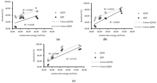 Relationship between surface free energy and percentages of drug dissolved (20 and 120 min) at polysorbate concentrations of (a) 0.1%, (b) 0.3%, and (c) 0.6%.