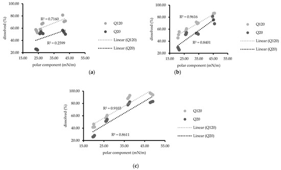 Relationship between the polar component and percentages of drug dissolved (20 and 120 min) at polysorbate concentrations of (a) 0.1%, (b) 0.3%, and (c) 0.6%.