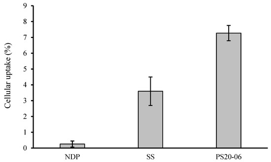 Illustrates the percentage of cellular uptake of NDP powder, SS, and PS20-06 after exposure with each formulation for 6 h (n = 3).