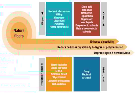 - Meenakshisundaram, S.; Fayeulle, A.; Leonard, E.; Ceballos, C.; Pauss, A. Fiber degradation and carbohydrate production by combined biological and chemical/physicochemical pretreatment methods of lignocellulosic biomass—A review. Bioresour. Technol. 2021, 331, 125053. [Google Scholar] [CrossRef]