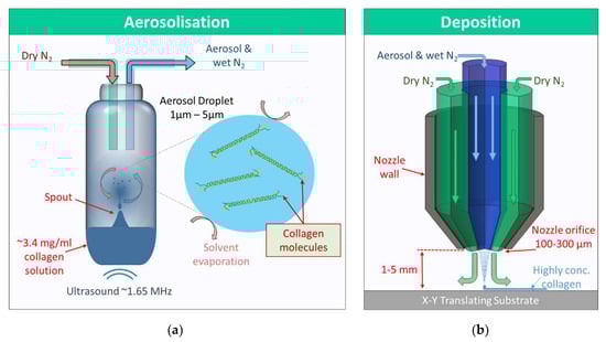 (a) Aerosolisation begins with 1.65 MHz ultrasonic waves forming a spout in the vial containing the collagen solution. Aerosol droplets are dispersed from the spout and become entrained in a nitrogen gas flow towards the deposition head. The rate of solvent evaporation is high due to the high surface area to volume ratio of the aerosol droplets and the dry nitrogen gas. (b) The aerosol and high humidity N2 is collimated by a co-axial flow of nitrogen, which further dries the aerosol droplets and separates them from the walls of the nozzle. The aerosol coalesces on a XY translating substrate forming highly concentrated collagen printed lines.