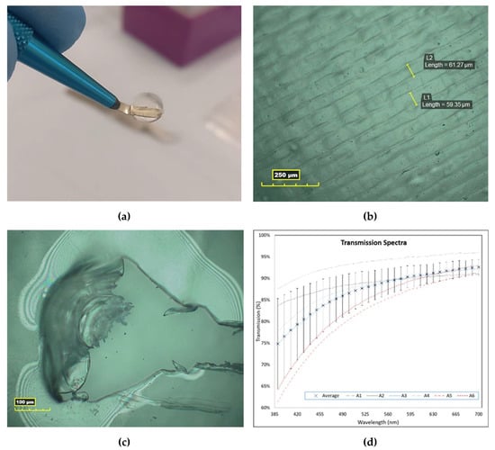 (a) A crosslinked 7 mm sample swollen in PBS held on a corneal scalpel; (b) print lines ≈60 µm in width in the centre of a 7 mm sample imaged under microscope after printing; (c) a failed sample in which a hole was torn to exhibit the birefringence seen in the samples. (d) The transmission spectra of each of the 7 mm samples measured, cross points with error bars represent the average transmission and standard deviation at 10 nm intervals.