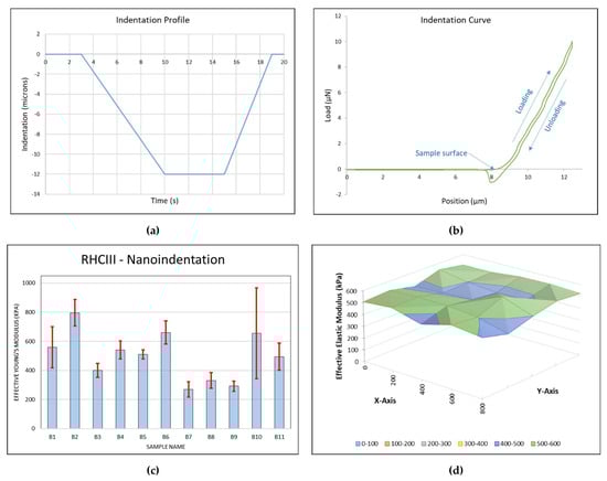 (a) The indentation profile used in the study which included an 8 µm off-set, so the sample was indented 4 µm. (b) The indentation curve illustrates the offset, with the load only increasing after the probe has moved 8 µm. The loading slope of the loading curve is used to calculate the elastic modulus. (c) The average effective E of each sample from 25 indentations with error bars representing the standard deviation. (d) An effective E map of sample B5 representing the 800 µm × 800 µm 25 point indentation matrix with 200 µm between indentations.