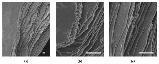 Whilst no pores could be resolved on the top or bottom surfaces of the samples, clearly defined distinct layers could be seen at the edges where samples were torn apart, as seen in Figure 4. These layers continued across the entire span of the samples, from what could be seen at the cross-sections, and hence were deemed to be the printed layers. The thickness of the layers was too thin to be accurately measured in SEM. Fibrous structures seen at tear edges could not be clearly resolved and would require TEM or AFM to determine any D-banded patterns, if present.