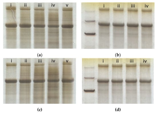 SDS-PAGE gels of ultrasonically atomised RHCIII, (a,c), and non-atomised RHCIII that was exposed to 1.65 MHz ultrasound, (b,d). Samples in gels (c,d) were digested with pepsin, whereas gels (a,b) are their non-digested controls. All lanes marked (i)–(iv) correspond to 0, 20, 60, and 120 min. Lanes marked (v) were re-solubilised printed samples. Molecular weight standards in the left-most lane of (b,d) mark 250, 150, and a high-intensity band at 100 kDa.