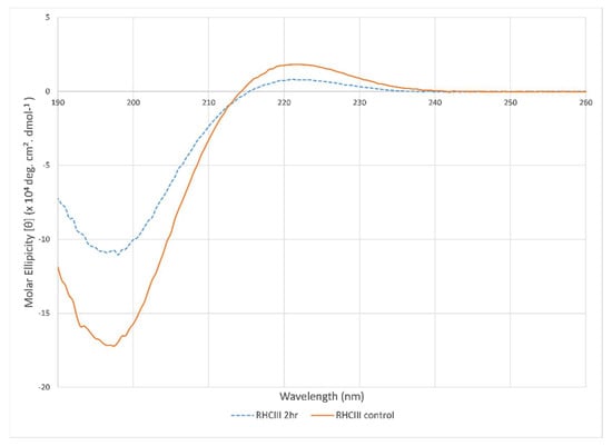 CD spectra of untreated RHCIII and 2-h sonicated RHCIII showing the characteristic collagen CD ellipticity with a positive peak centered on 221 nm and a negative peak centered on 197 nm.