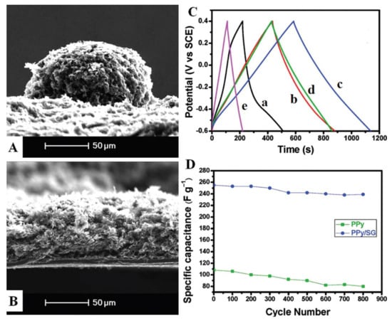 (A) SEM micrograph of PPy/SG nanocomposite formed at 1 C cm−2. (B) Image of the nanocomposite deposited at 2 C cm−2. (C) Charge/discharge curves of nanocomposites grown at 0.5 (a), 1.0 (b) 2 (c), and 4 C cm−2 (d), respectively, and (e) SG film in the aqueous solution of 1 mol L−1 KCl. (D) Cycling stability test of PPy and PPy/SG nanocomposites. Reprinted with permission from Ref. []. Copyright 2010 American Chemical Society.