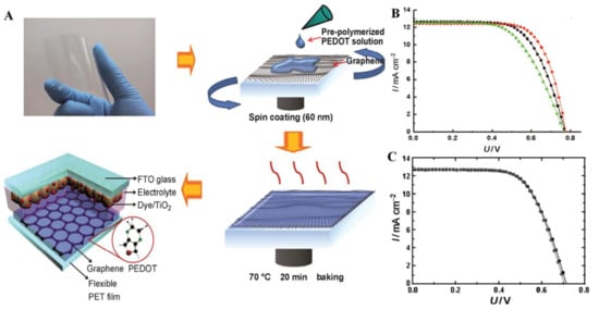 (A) G-coated PET and representation of the preparation process of a DSSC with a PEDOT/G/PET counter electrode. (B) J–V characteristics of the cells with PEDOT/G/PET (black), PEDOT/PET (green) and Pt/ITO/PET (red) as counter electrode. (C) J–V characteristics of bended (circles) and pristine (squares) DSSCs using a PEDOT/G/PET counter electrode. Reprinted with permission from Ref. []. Copyright 2012 WILEY-VCH Verlag GmbH & Co. KGaA, Weinheim.