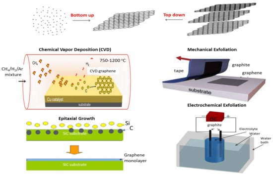 The synthesis of G can be carried out following two different approaches: (1) bottom-up method; and (2) top-down method. The former approach is based on the synthesis of G from small units of carbon to obtain graphene layers. The most common techniques based on this methodology are chemical vapor deposition (CVD) and epitaxial growth (Scheme 2).