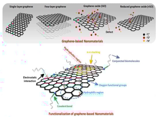 Schematic illustration of graphene-based nanomaterials, and covalent and non-covalent functionalization approaches. Reprinted from Ref. [].