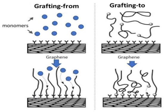 These are based on the anchoring of polymer-growth initiator molecules to the G-based material surface; then, the polymerization can start in these anchored initiators []. This technique avoids the possible steric hindrance since the polymer grows directly onto the G-based material surface, allowing the grafting of polymers with a high molecular weight, hence nanocompounds with an elevated grafting extent can be synthesized. Though, it requires a fine control of the reaction conditions as well as the amounts of initiator and substrate. Given that the initiator requires a functional group to be grafted, GO and rGO are more frequently used than G []. However, it is also feasible to use G if a pre-functionalization step is carried out to introduce functional groups within the structure. Several grafting-from techniques have been described in the literature, the most important being atom transfer radical polymerization (ATRP), reversible addition fragmentation chain transfer polymerization (RAFT), polycondensation, ring opening polymerization (ROP) and Ziegler–Natta polymerization.
