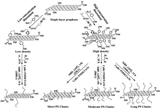 The ATRP is a radical reaction that creates a carbon–carbon bond with a transition metal catalyst (a copper halide and an amine-based ligand). It comprises a fast initiation process and the development of a dynamic equilibrium between dormant and growing radicals []. It is suitable for the polymerization of many monomers with diverse chemical functionalities and provides good control of molecular weight, polymer composition, and structure with a low polydispersity. Though, it has some disadvantages, such as the elevated catalyst concentration needed and its removal that can be difficult and expensive, hence limiting its use on a large scale. Besides, it is an air-sensitive reaction, difficult to perform in aqueous media. For instance, it has been used for synthesizing a polystyrene (PS)/G nanocomposite []. rGO sheets were initially prepared via reduction of GO in the presence of a surfactant. Then, aryl diazonium salt as an ATRP initiator was covalently linked to the rGO sheets. Methyl 2-bromopropionate was used as a grafting initiator to control the chain propagation on the surfaces of graphene sheets (Scheme 7). The length and grafting density of polymer chains were tailored by changing the amount of the grafting initiator and its molar ratio with styrene monomer. Significant increases in thermal conductivity were observed for the nanocomposite with only 2.0 wt% rGO. Furthermore, the resulting PS nanocomposites with 0.9 wt% rGO showed about 70% and 57% increases in tensile strength and Young’s modulus, respectively. Additionally, it has been applied for the preparation of poly(methyl methacrylate) (PMMA) grafted from GO []. The initiators were immobilized by esterification reaction with the carboxylic groups of GO. In this work, the polydispersity of the grafted PMMA was approximately one, demonstrating a well-controlled process. This PMMA-g-GO displayed good solubility in organic solvents such as chloroform and methanol, and could be used as nanoreinforcement in a PMMA matrix. Due to the strong interfacial interactions between the PMMA-g-GO and PMMA, an efficient load transfer was attained, thus improving the mechanical and thermal properties of the nanocomposites. For instance, the addition of 1 wt% PMMA-g-GO led to a noteworthy improvement in the elongation at break, resulting in a more ductile and tougher material, and also increased the initial degradation temperature of the matrix by around 50 °C.
