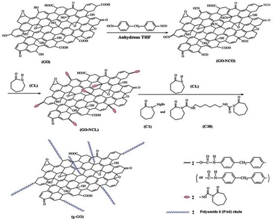 ROP is a method in which one termination of the polymer chain bears a group suitable to react with cyclic monomers. The end group of a compound acts as initiator and forces the opening of the first cyclic monomer, which is added to the structure as a new chain with its end group being reactive, such as the previous initiator. The polymerization continues adding more cyclic broken monomers to the structure. Different researchers also used this method for anchoring polycaprolactone (PCL) and poly(L-lactide) (PLLA) to GO [,]. This route was developed to prepare polyamide 6 (PA6)/GO composites (Scheme 9): ε-caprolactam (CL) was fixed onto the GO sheets coupling by 4,4′-methylenebis(phenyl isocyanate), and then PA6 was grafted from the GO surface by in situ anionic ring-opening polymerization. The polymerization was performed at 150 °C and for 20–40 min, by using a caprolactam magnesium bromide initiator (C1) in combination with a difunctional hexamethylene-1,6-dicarbamoylcaprolactam (C20) activator, leading to about 74 wt% polymer content []. The crystallization temperature, degree of crystallinity, and mechanical properties of PA6/GO nanocomposites increased, especially for the composites with GO loading less than 0.2 wt%, owed to the strong interfacial adhesion. This simple and effective approach can offer novel possibilities for expanding the applications of polymer-g-G nanocomposites.